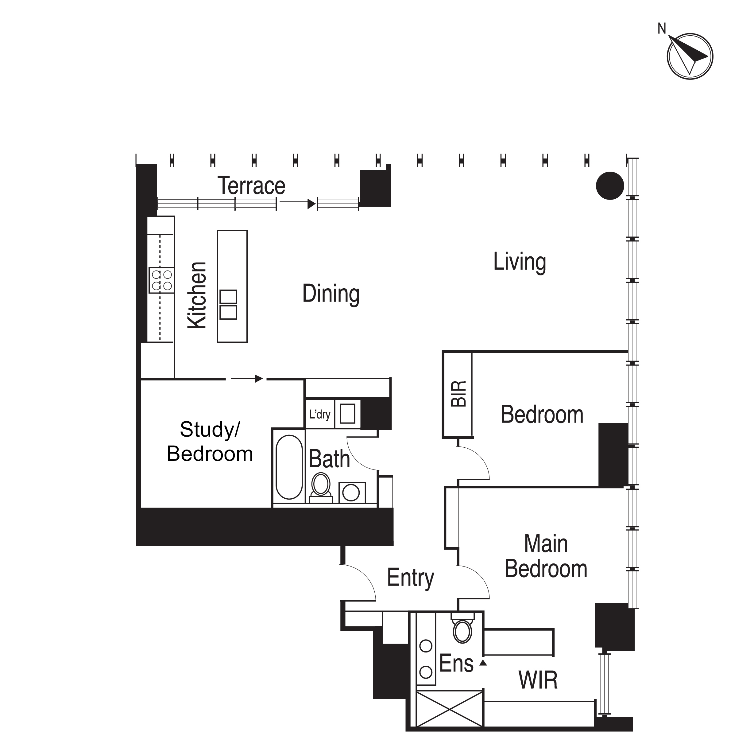 The apartment offers large open plan living areas with two generous sized bedrooms and a study that can double as a third bedroom. The master features a spacious ensuite, including dual vanities and walk-in robes, plus additional sound proofing to the full-length windows to ensure that city noise doesn’t interrupt sleeping. The second central bathroom offers a bath and European laundry.